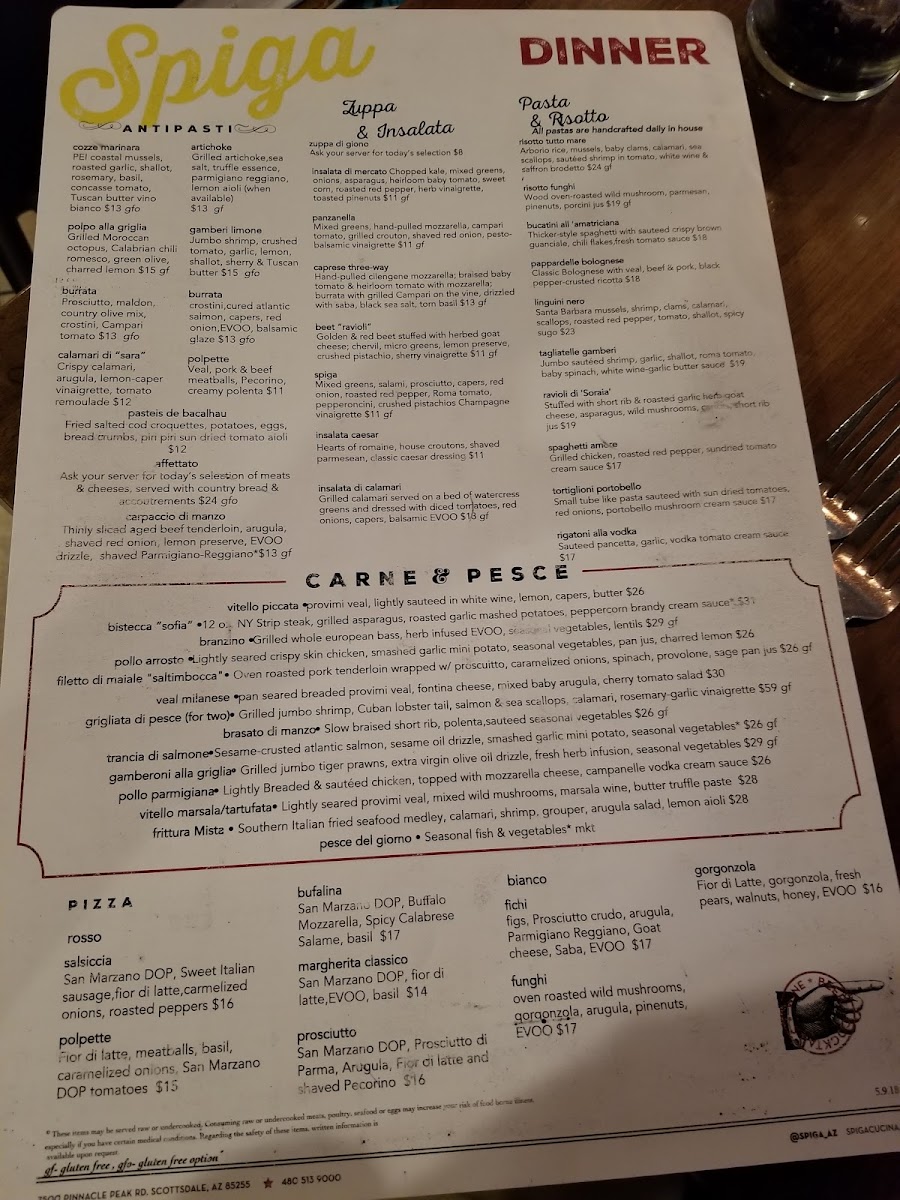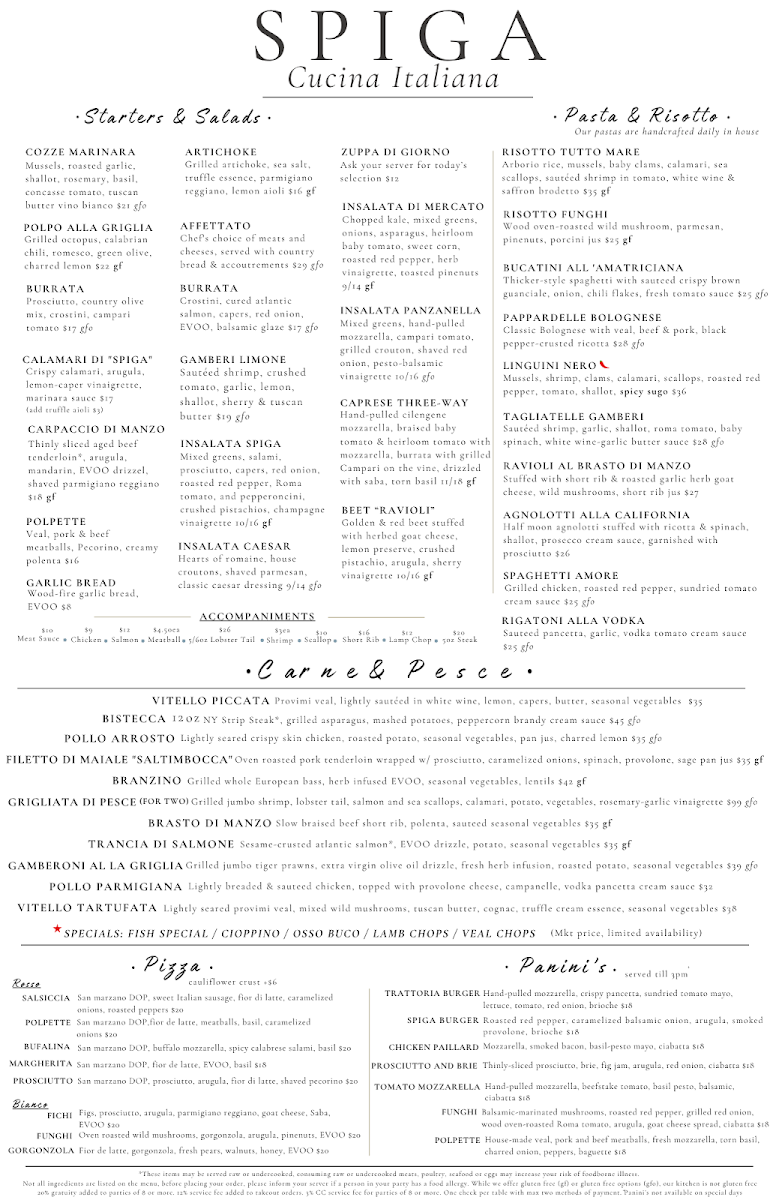 Spiga Cucina Italiana offers a thoughtfully crafted menu that balances classic Italian comfort with fresh, vibrant ingredients. The selection moves smoothly from light antipasti to satisfying pastas, risottos, and wood-fired pizzas, making it easy to find a dish for any dining occasion—whether a casual lunch, a relaxed dinner, or a cozy gathering with friends.